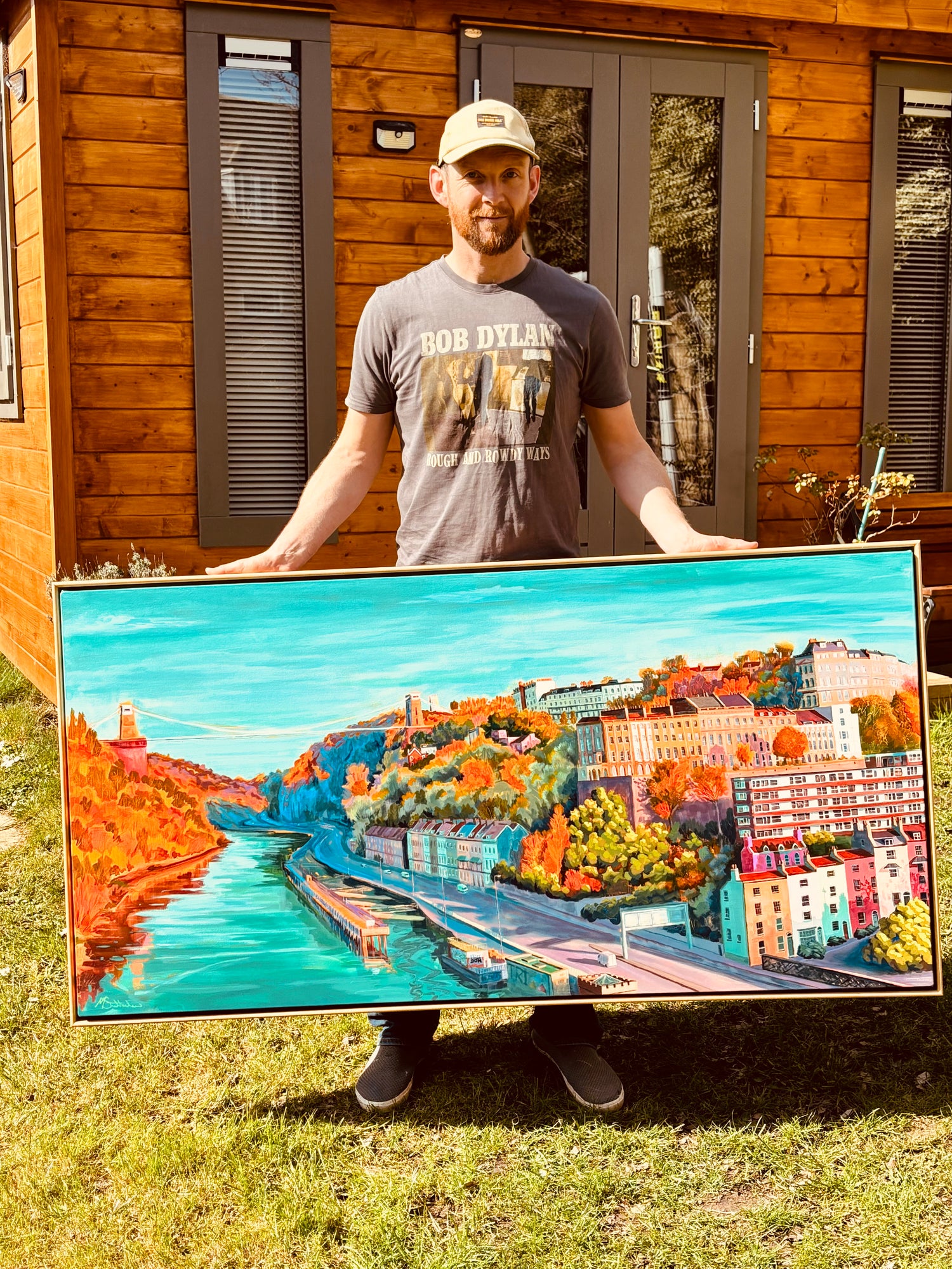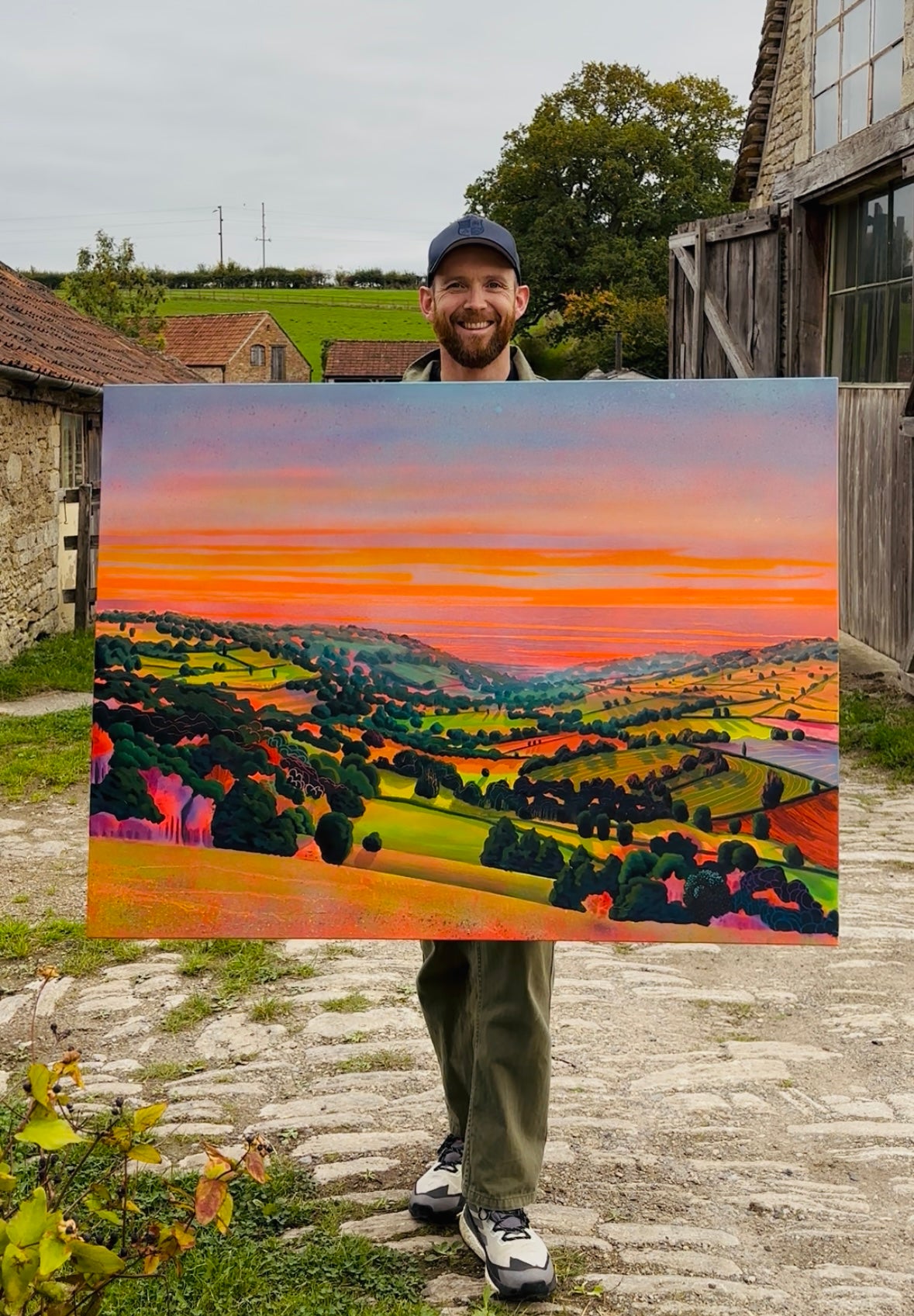 Holding 'Sunrise on Corsham Court 1', a light-filled landscape measuring 3 feet by 4 feet and completed in oil.