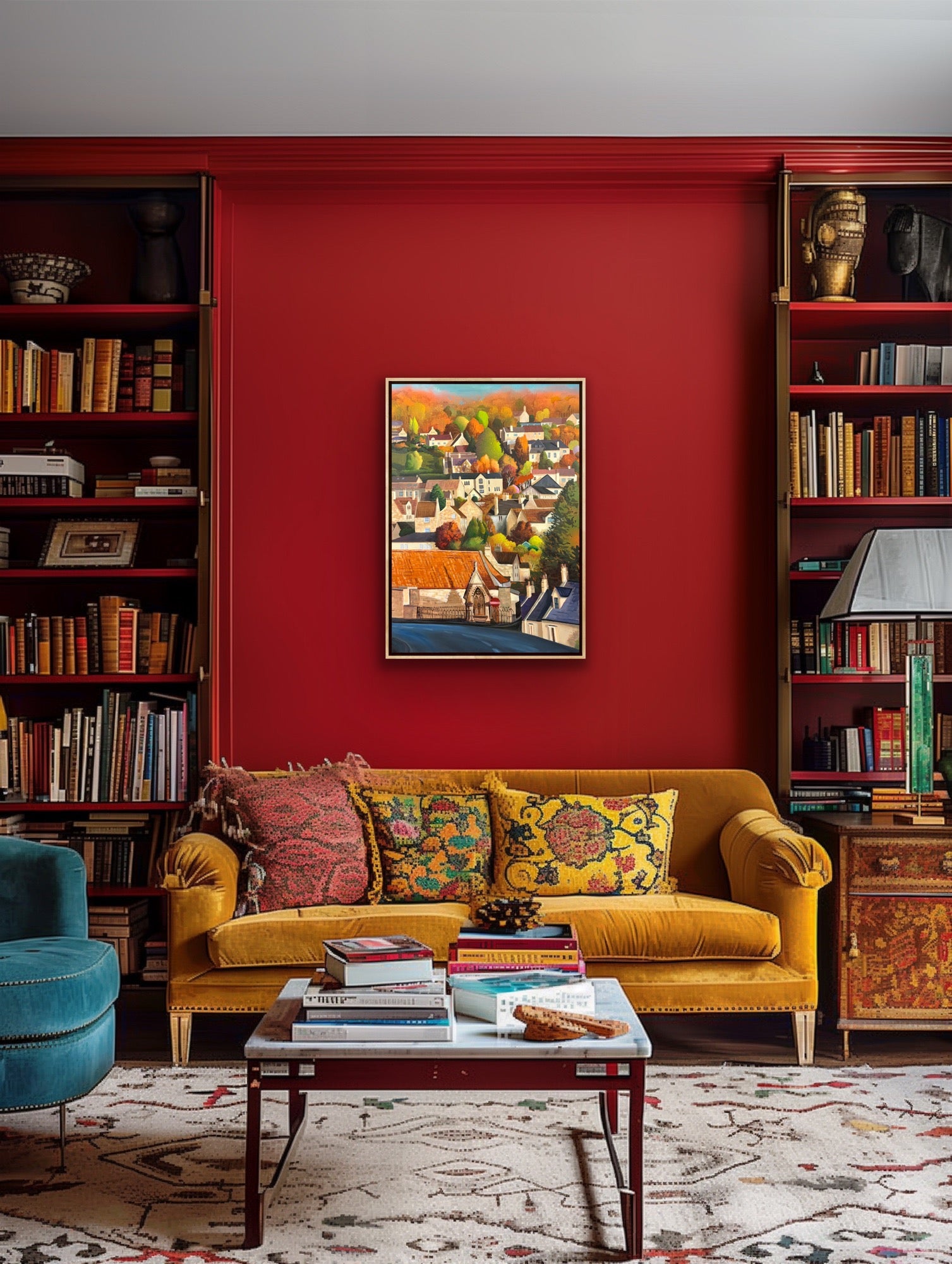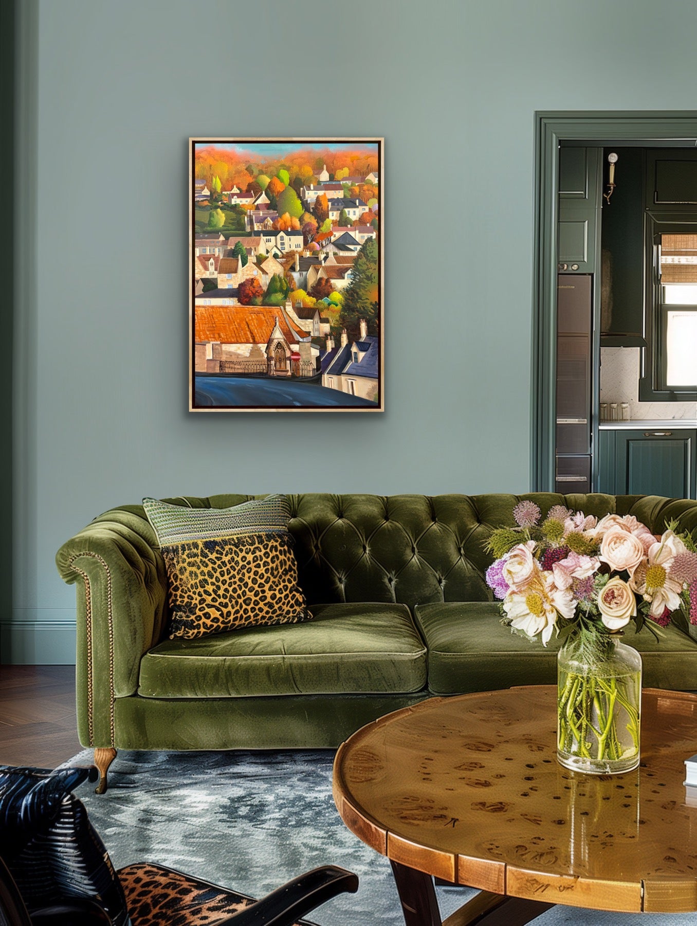 Autumn in Box captures the warm tonal sweep of Box, Wiltshire — the honey‑coloured Bath stone buildings and the autumnal colours climbing the hillside. Painted in acrylics by Michael Sutherland on a robust 100 x 70 cm gallery canvas, the work is presented in a handmade beach float frame that has been varnished twice for a refined, durable finish. The painting itself received two isolation coats and two layers of varnish to protect colour and surface texture while preserving the artist’s mark-making.