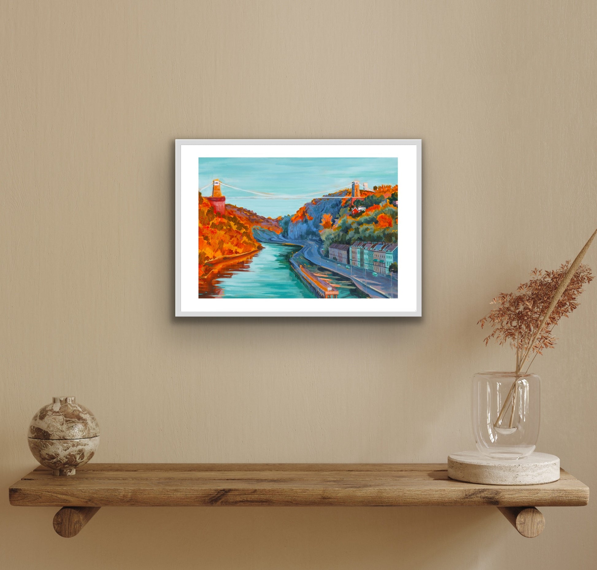'Back to Bristol - Bridge' shows a cropped composition of the original piece called 'Back to Bristol' and features the iconic Clifton Suspension bridge in Michael Sutherland’s trademark colour palette.