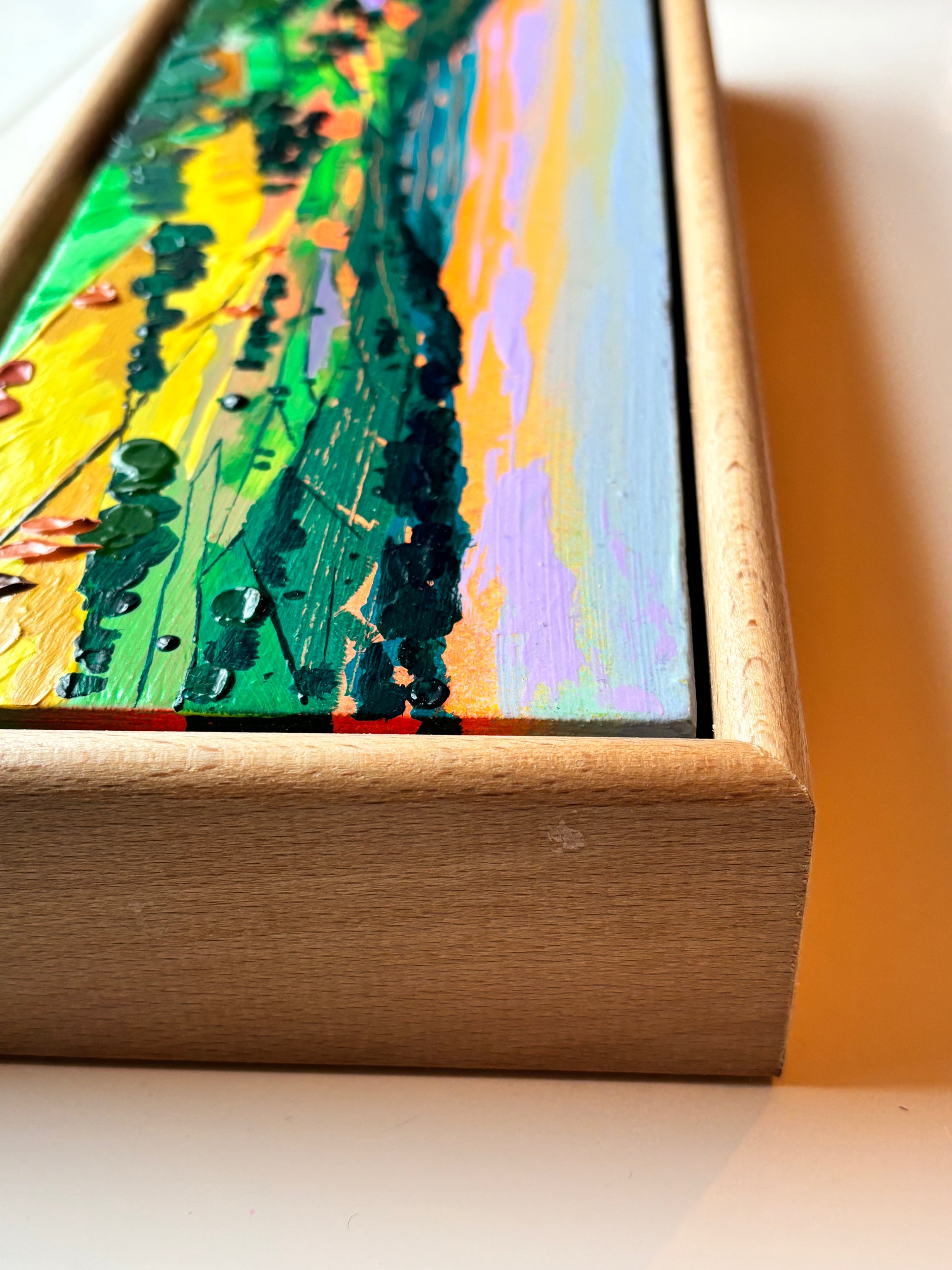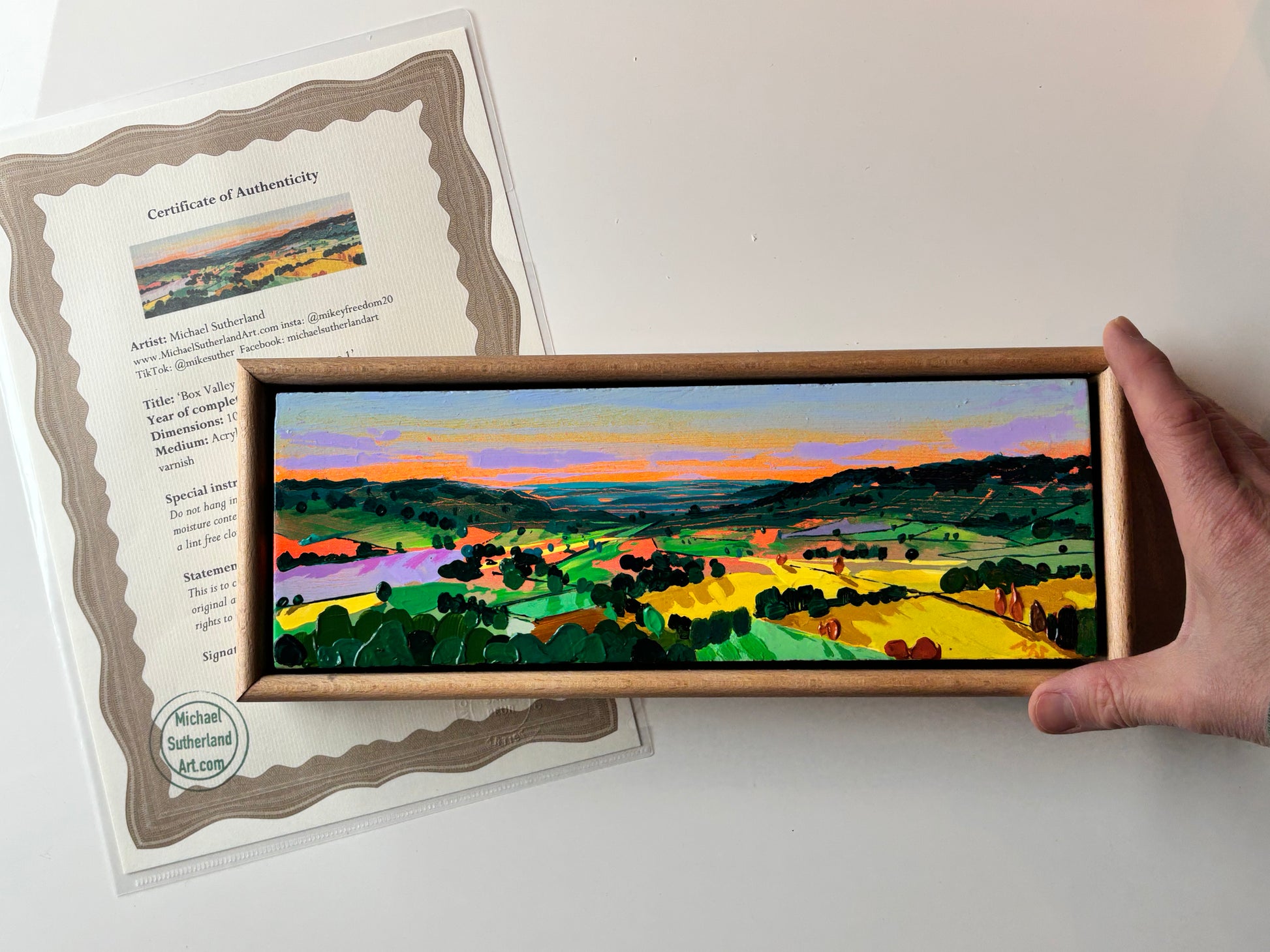 Box Valley (By Brook Valley) is a stunning stretch of Wiltshire countryside near Colerne, Corsham, Box, and Bath. Each time I see this beautiful spot it appears different. This piece is a small but perfectly formed original artwork (roughly the size of a letterbox) showing the valley on a winter’s afternoon.