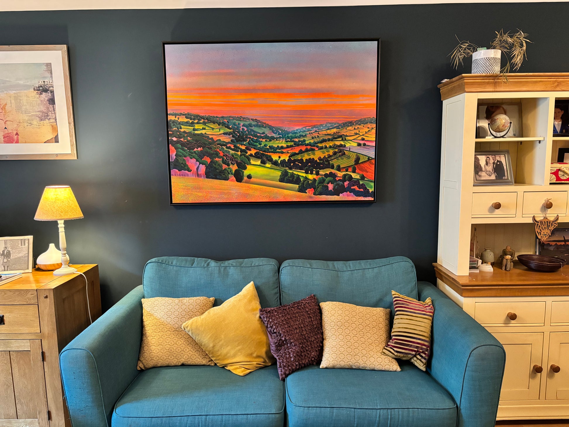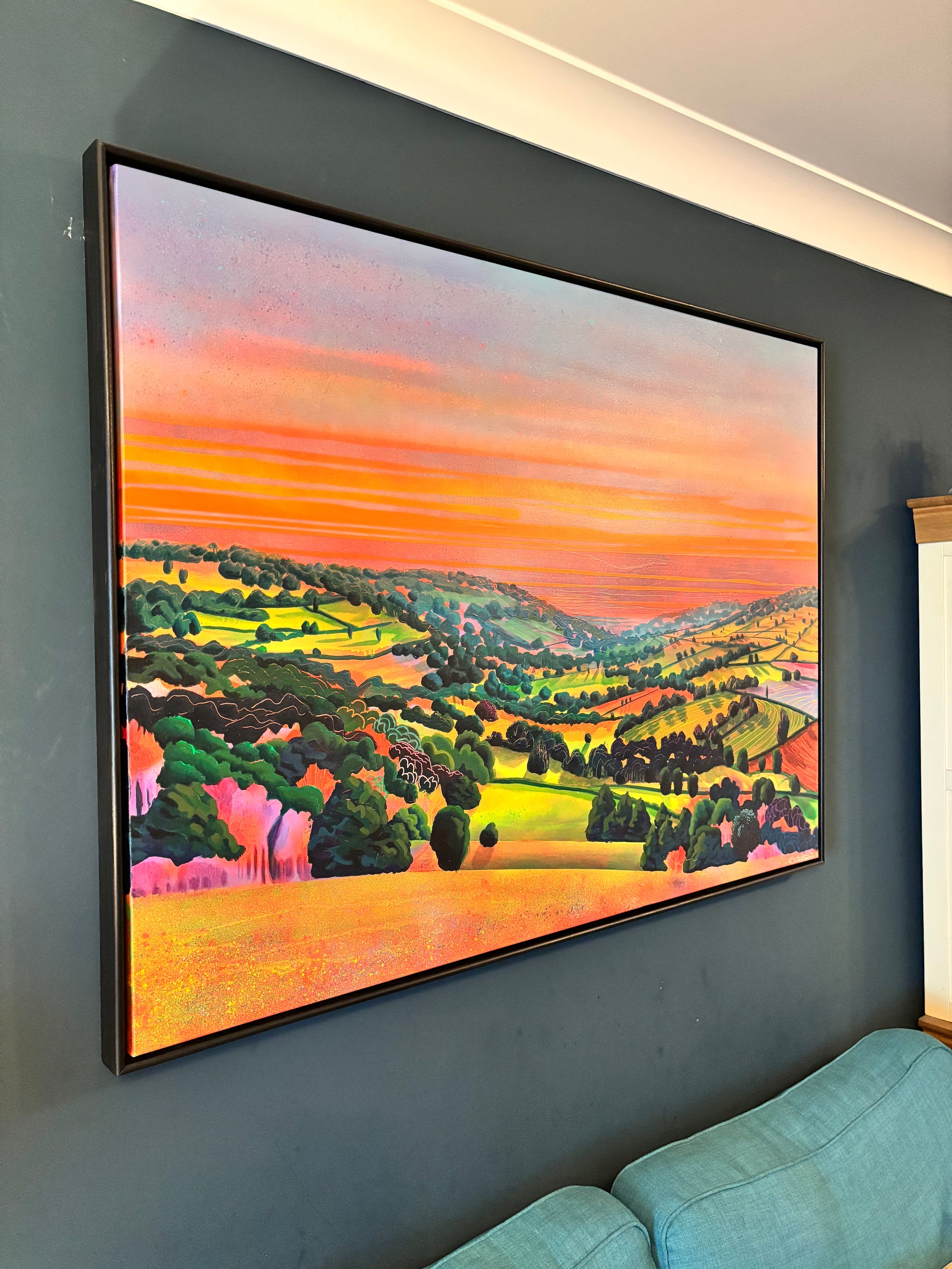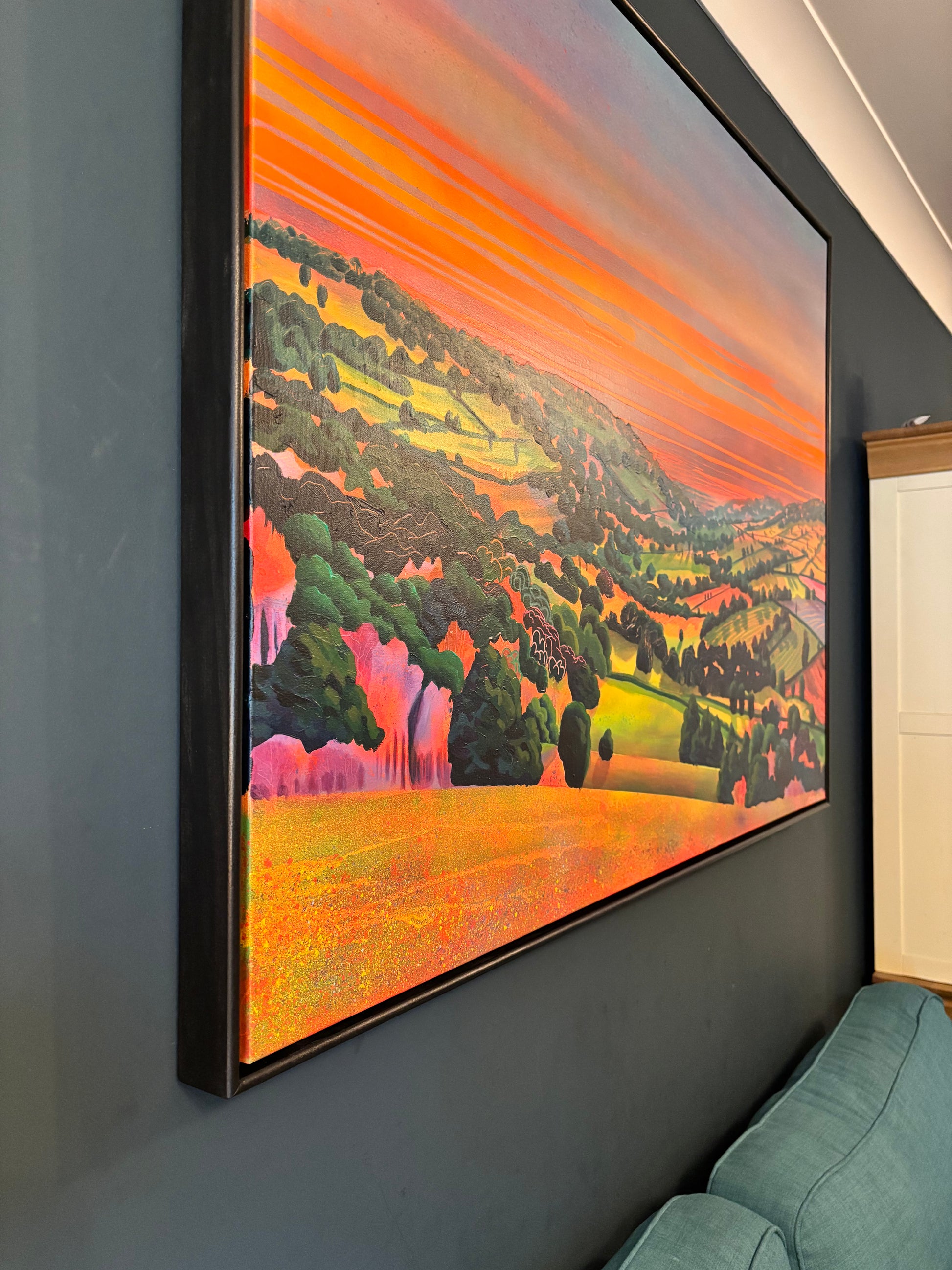 A dreamlike, atmospheric original painted in acrylics. Bold textures and layered colour explore light and mood across the By Brook Valley at dusk.