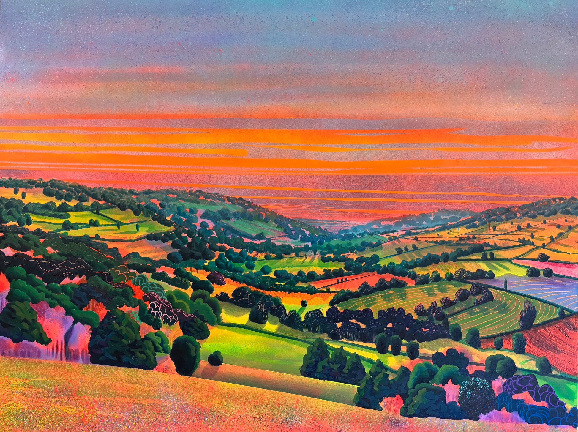 A dreamlike, atmospheric original painted in acrylics. Bold textures and layered colour explore light and mood across the By Brook Valley at dusk.
