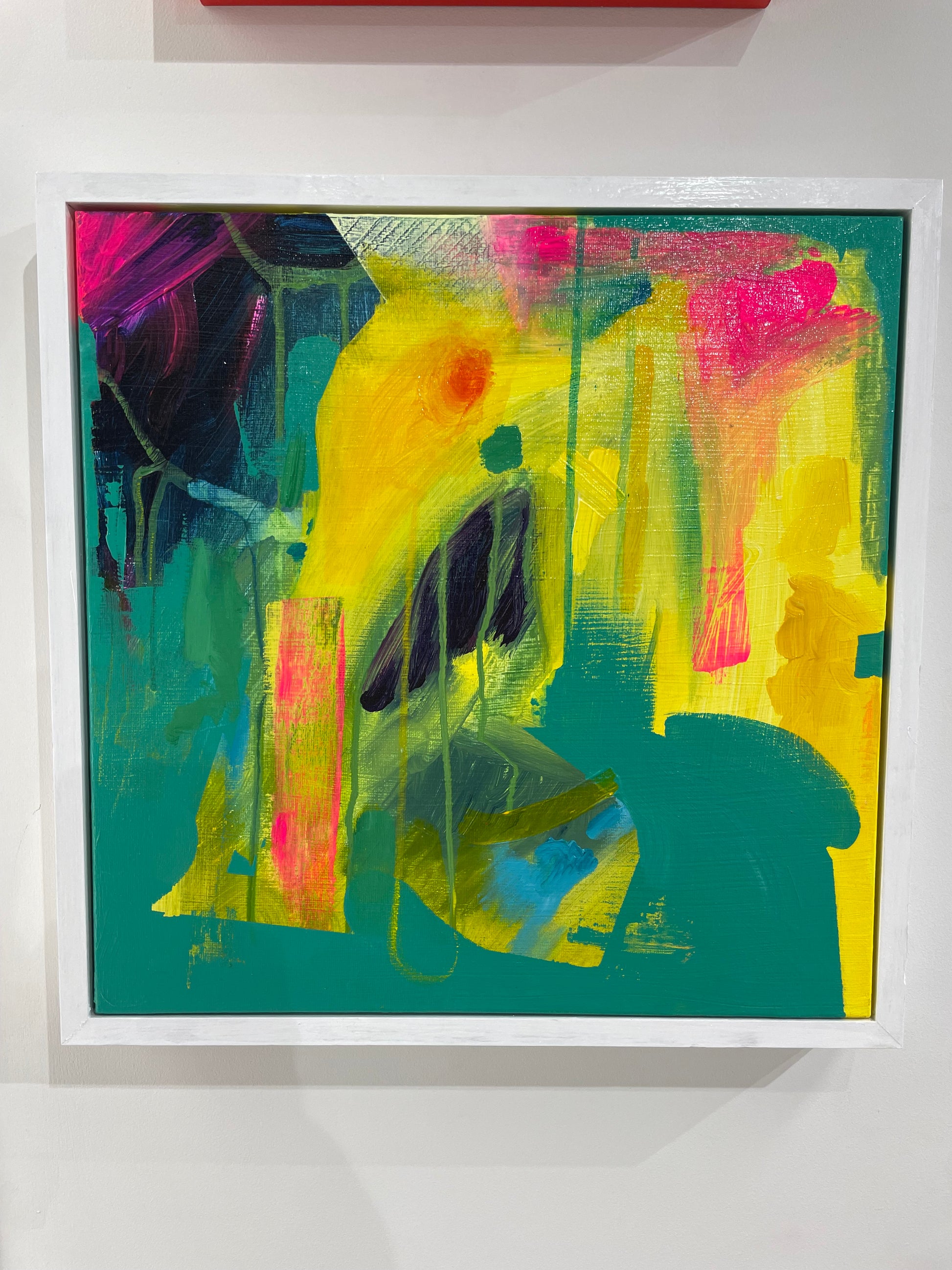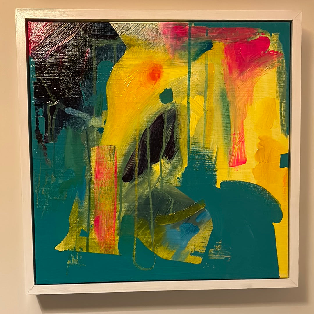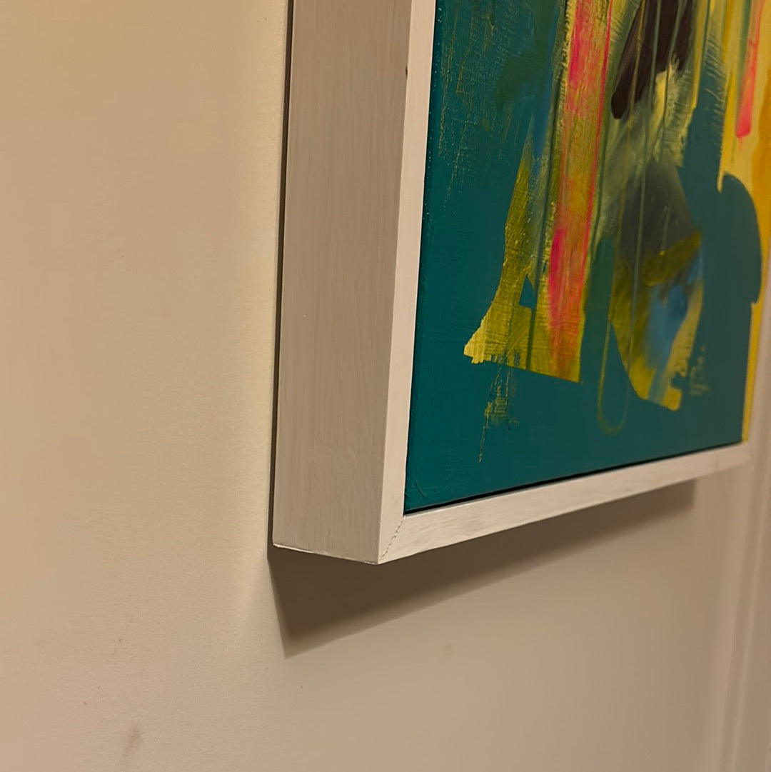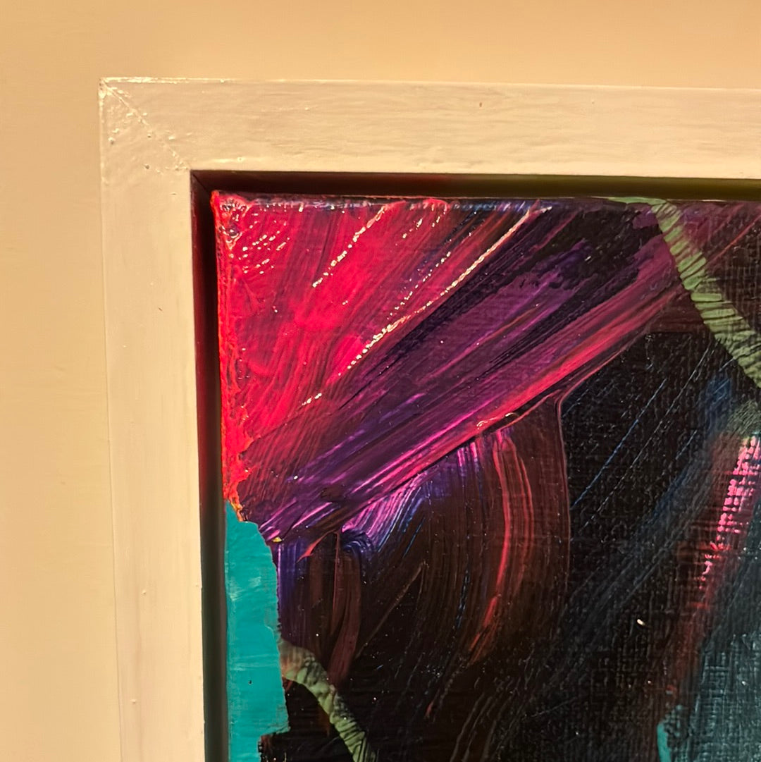 ‘Fancy Nancy’ is an original artwork in acrylics and oils, framed beautifully in a neutral white tray frame. Abstract and powerful, this piece will elevate any room and invites the viewer to construct their own narrative. This artwork represents Michael Sutherland’s first foray into abstract expressionism.