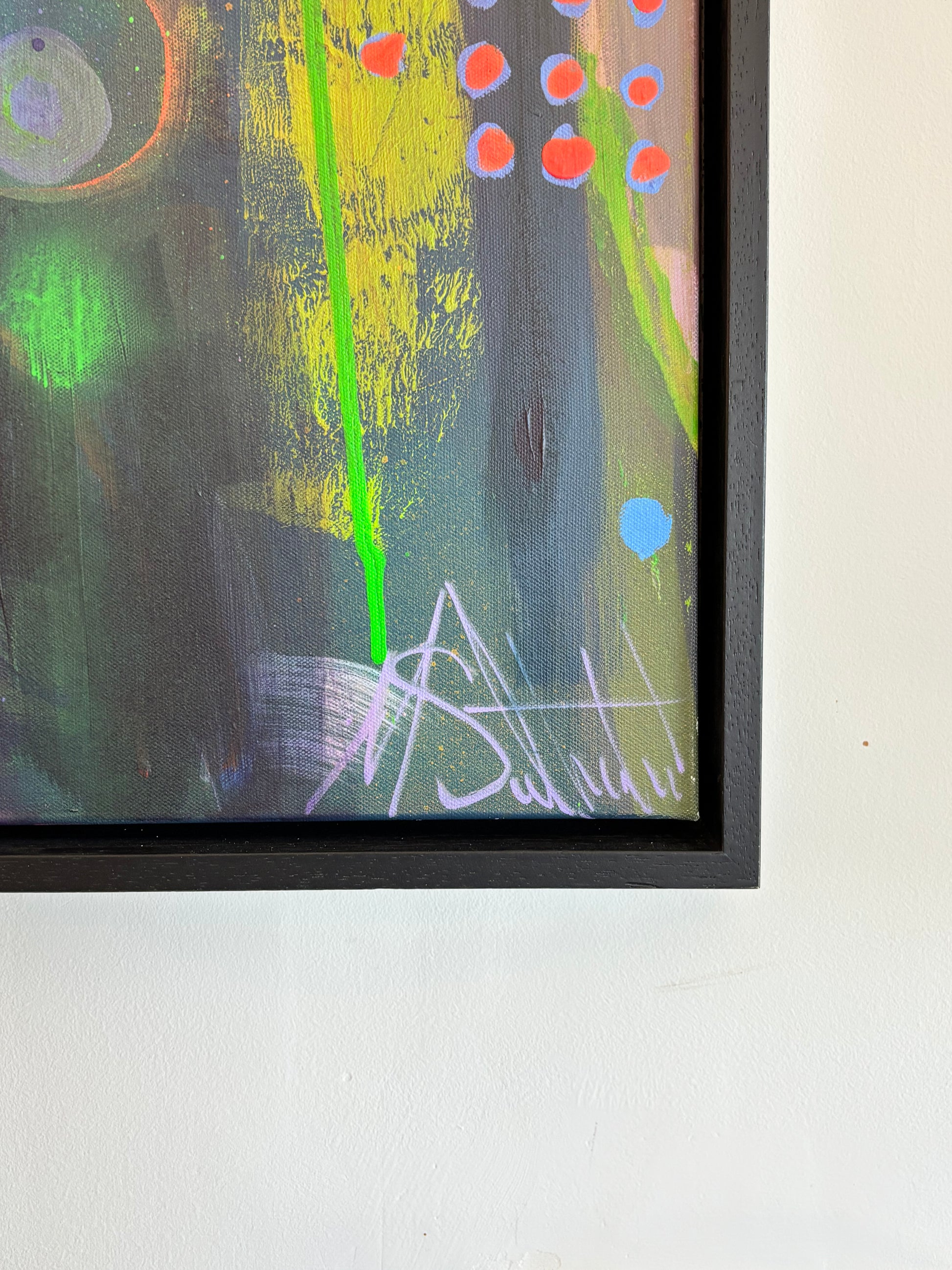 Unique mixed media artwork, one of five featuring Fortuna Ashbank. Initially hand-drawn with a digital pencil, this painting evolved on the canvas using spray paint, acrylic paint and Posca markers.