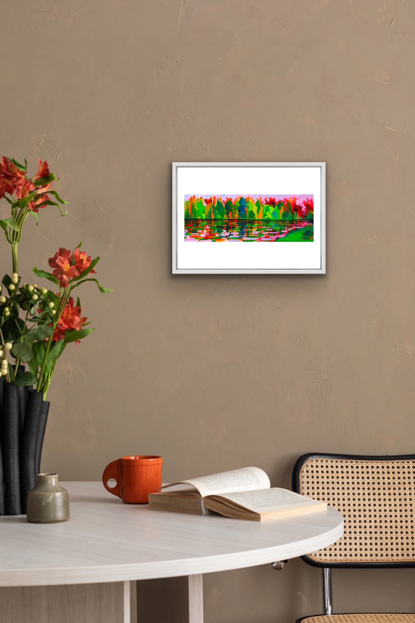 Full-size canvas artwork in a beautiful handmade float frame. Comes with unique painted hand embellishments by the artist and is signed.