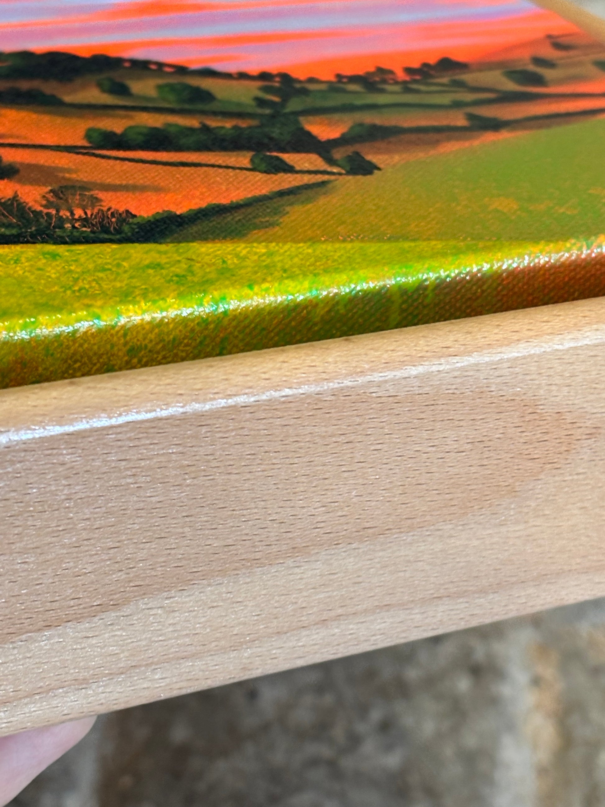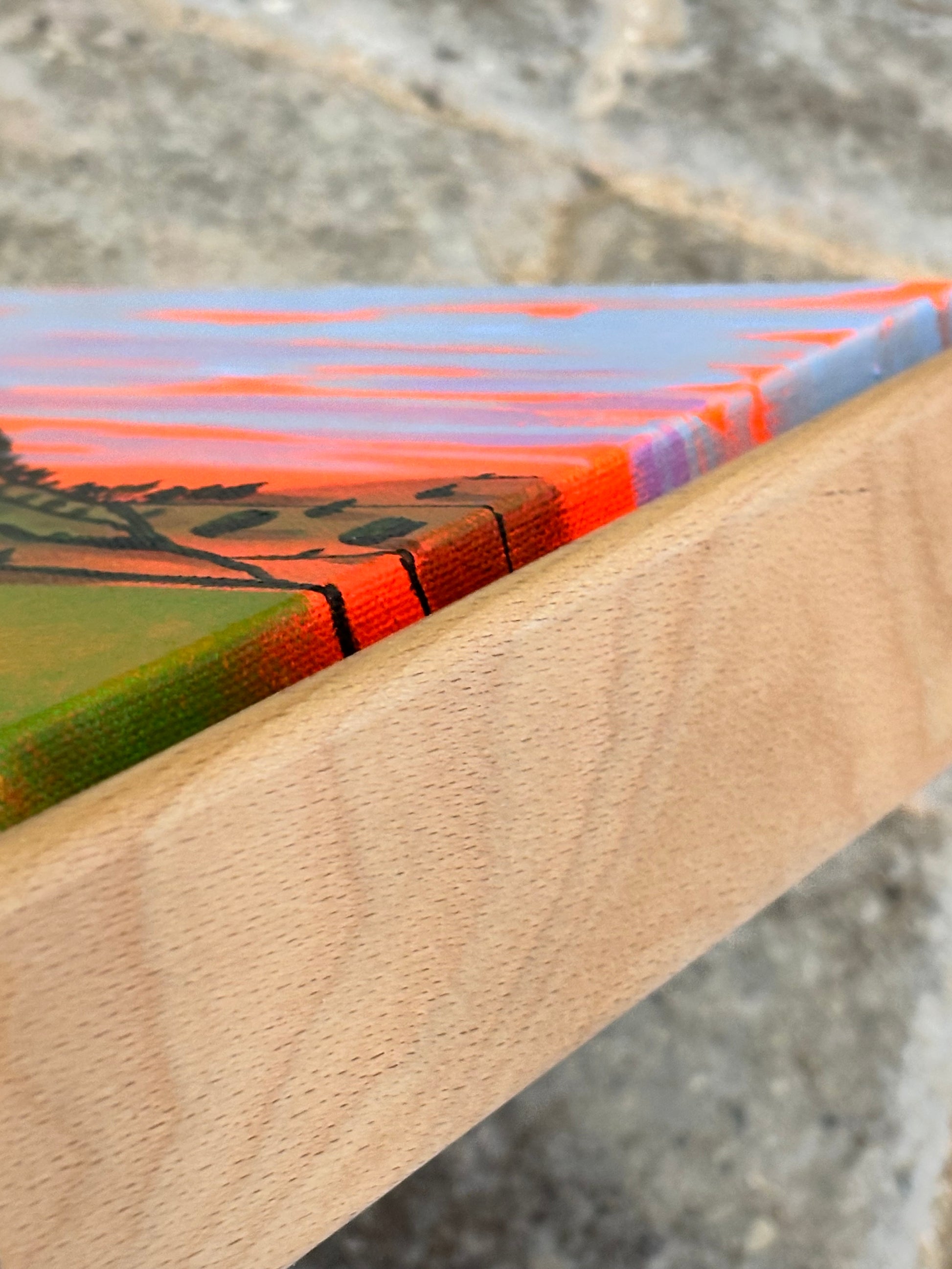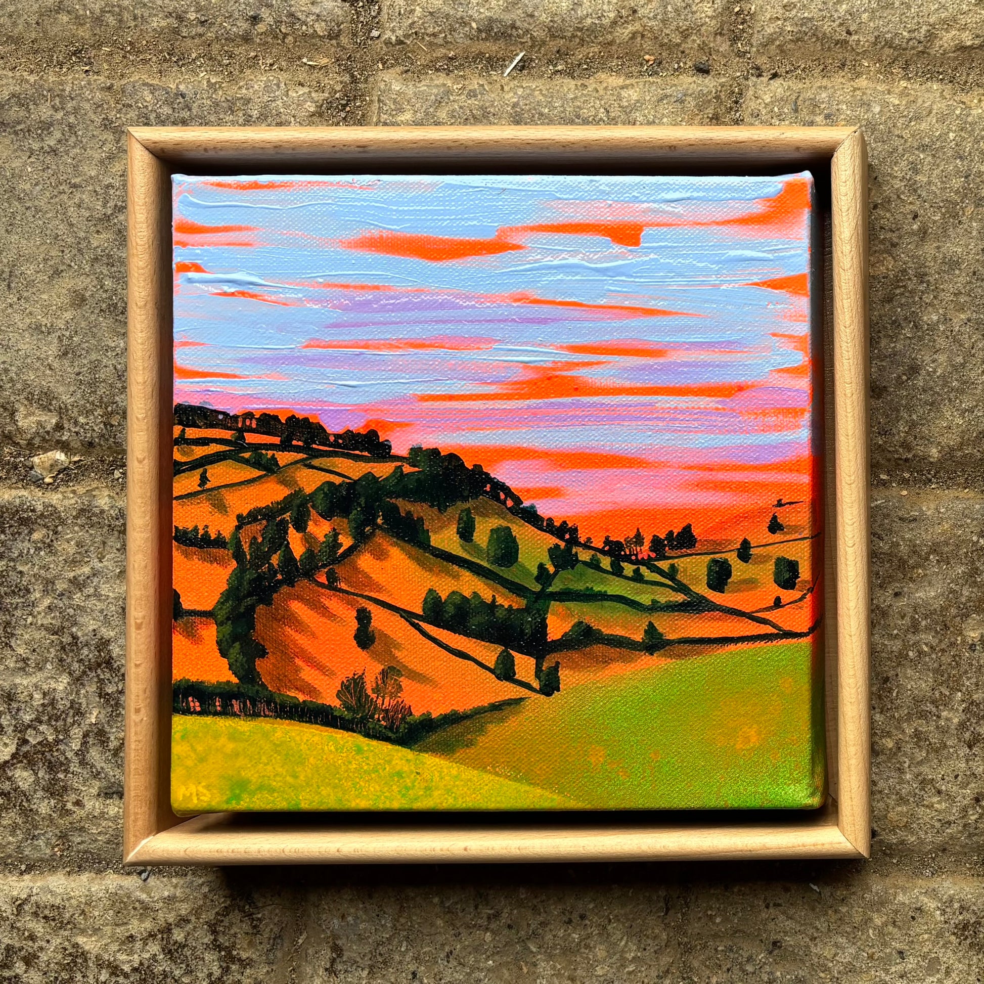 Experience tranquility with this vibrant depiction of a hilly landscape at sunset, crafted meticulously using acrylics.