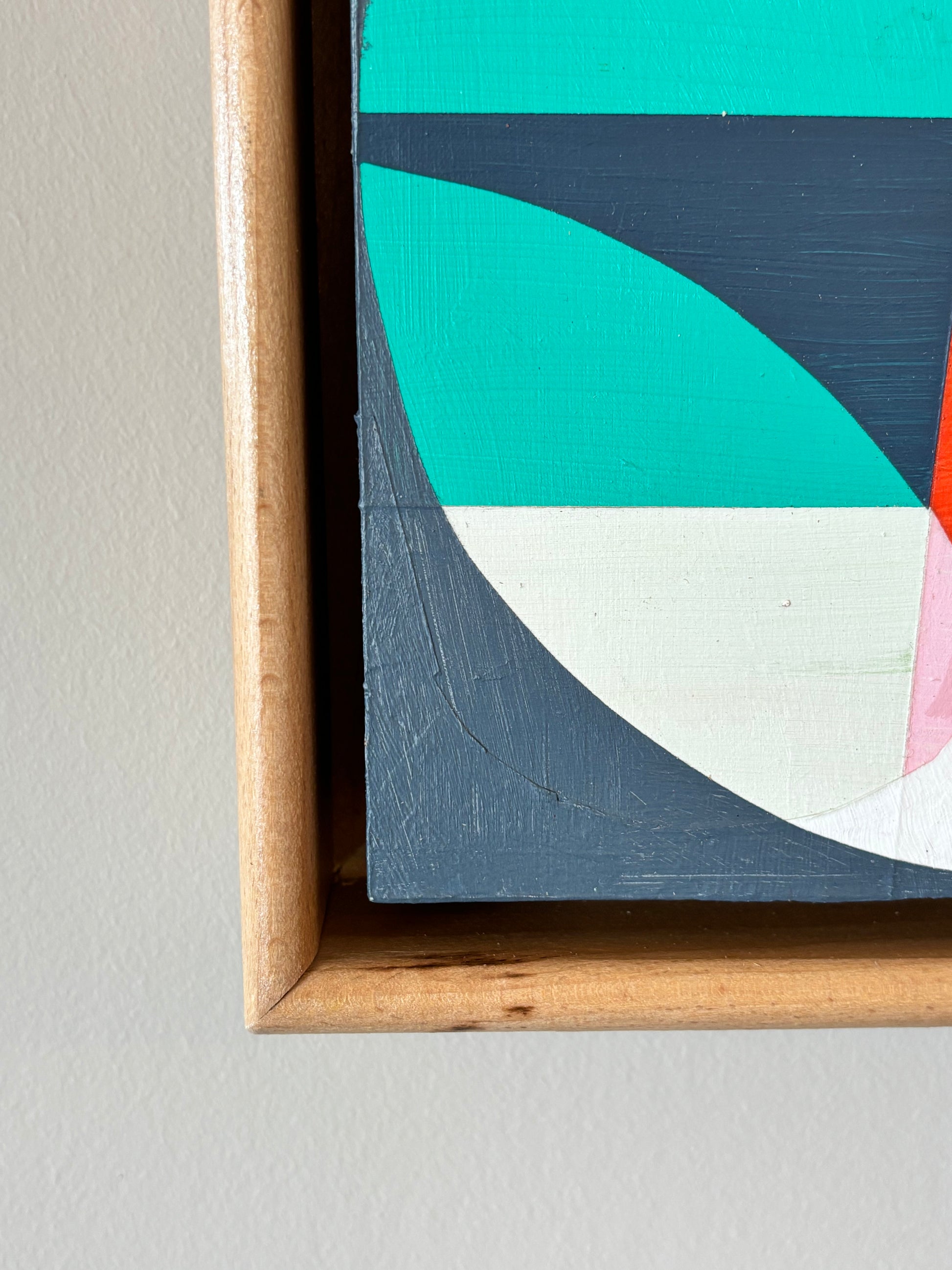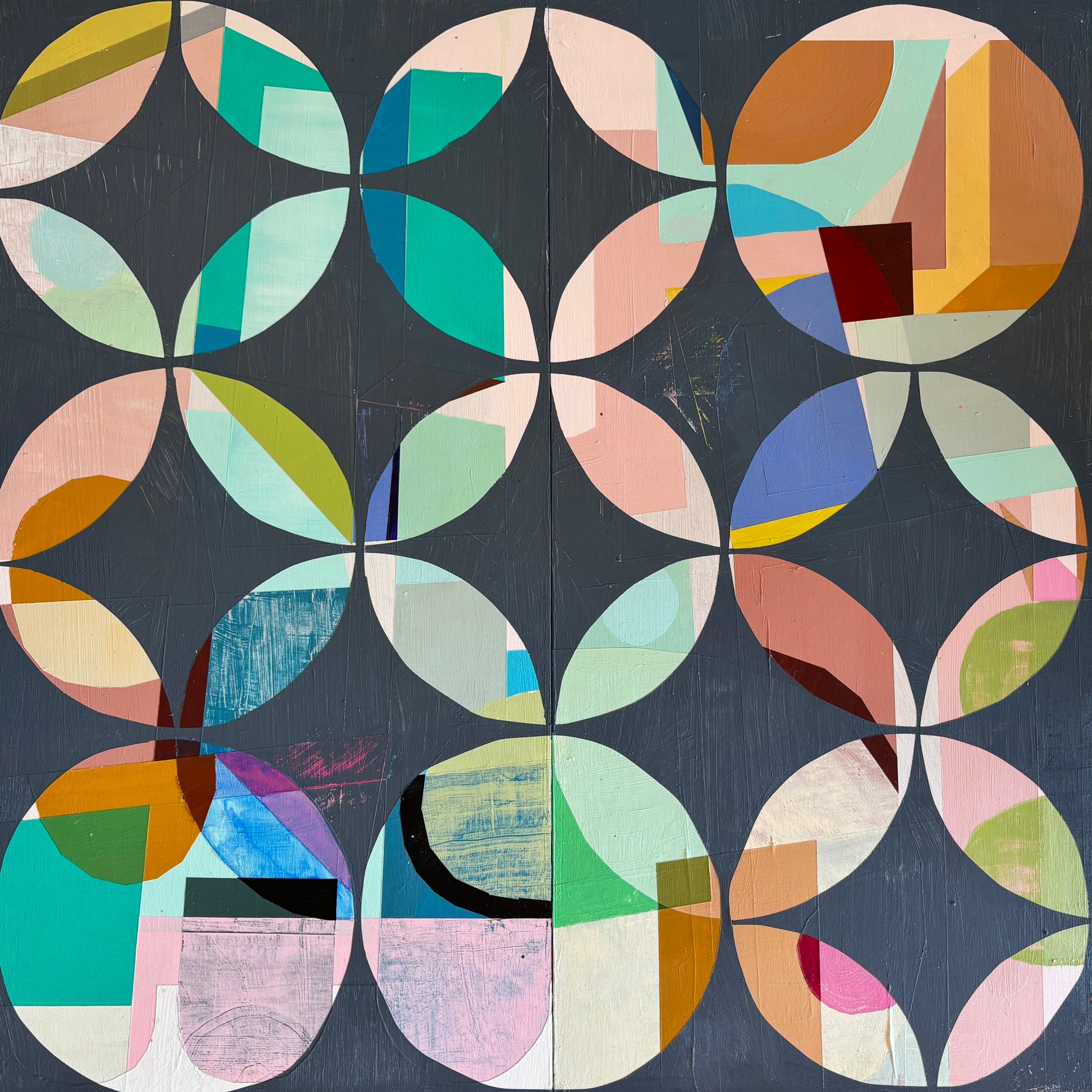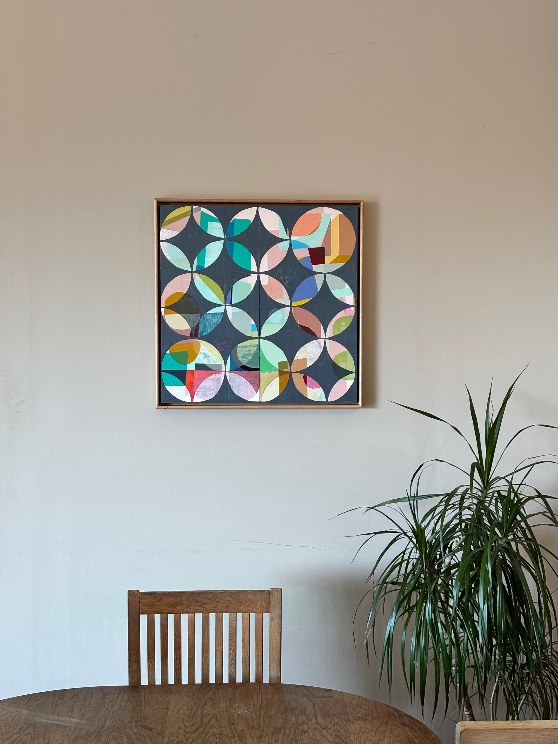 A dynamic arrangement of overlapping circles, each divided into colourful geometric segments. The interplay of shapes creates a harmonious yet energetic composition, evoking a sense of rhythm and movement. This abstract piece balances boldness with subtlety, inviting the viewer to explore its intricate patterns and contrasts.